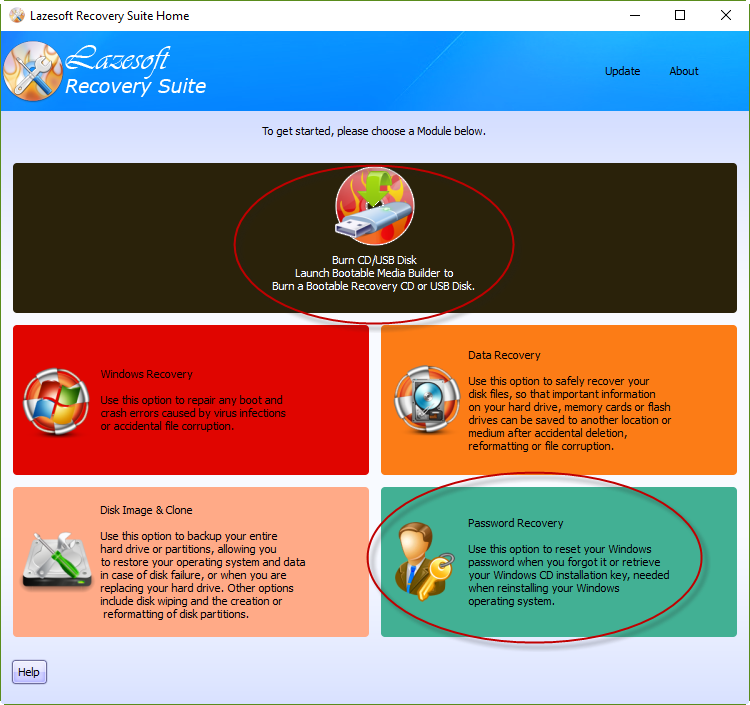 Lazesoft Recovery permet de réparer une installation Windows corrompue, de restaurer des fichiers corrompus ou effacés, de faire un backup système, mais nous nous intéresserons ici qu'à sa faculté de créer une clé bootable et à la fonction de d'effacement de password Windows. A ce niveau il suffit de cliquer sur "Burn CD/USB disk" ce qui permettra de créer un support bootable contenant le logiciel Lazersoft Recovery.