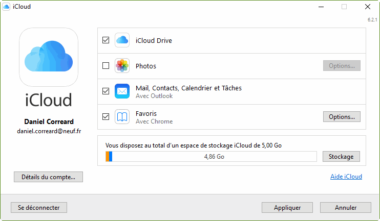 On utilise ici le Panneau de Commande iCloud à installer sous Windows